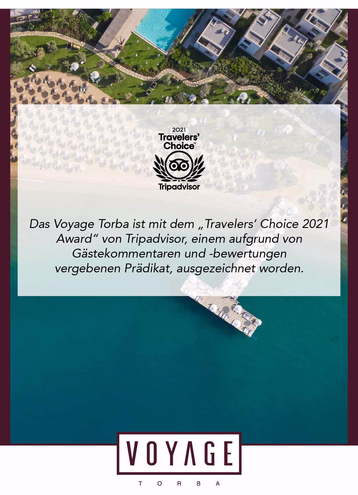 Das Voyage Torba ist mit dem „Travelers‘ Choice 2021 Award“ von Tripadvisor, einem aufgrund von Gästekommentaren und -bewertungen vergebenen Prädikat, ausgezeichnet worden.