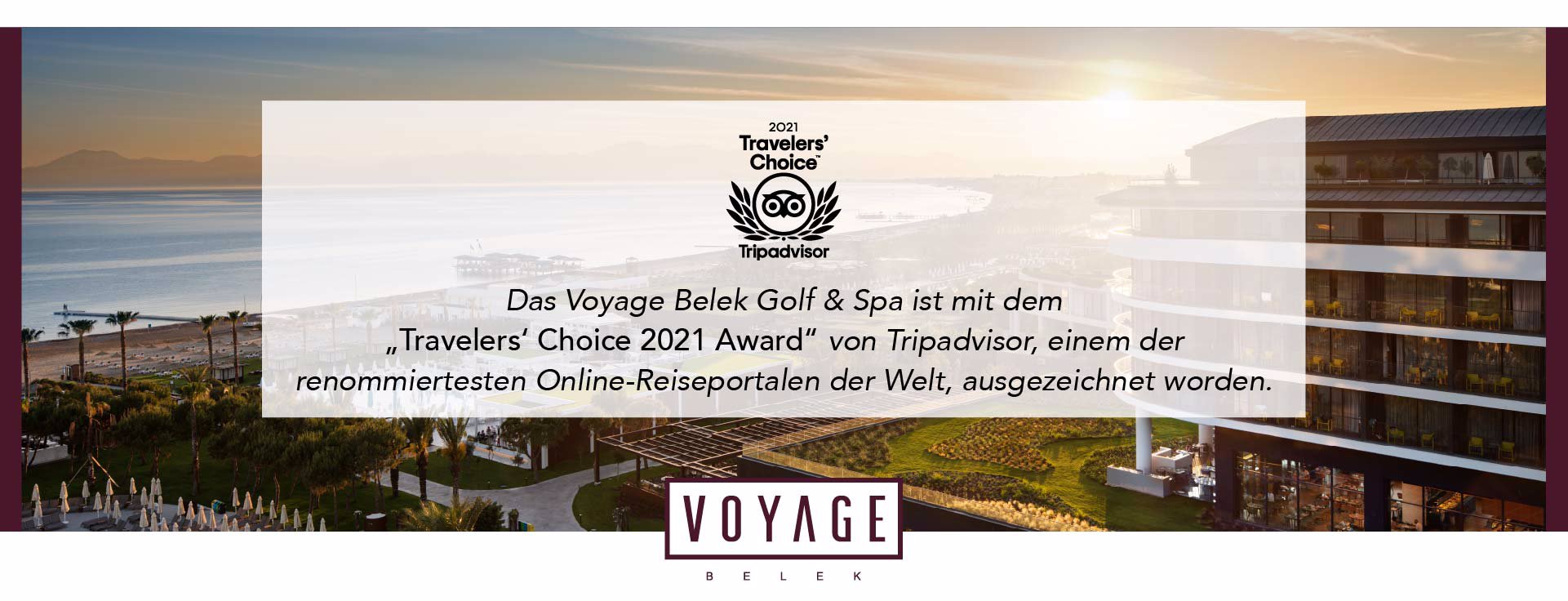 Das Voyage Belek Golf & Spa ist mit dem „Travelers‘ Choice 2021 Award“ von Tripadvisor, einem der renommiertesten Online-Reiseportalen der Welt, ausgezeichnet worden.