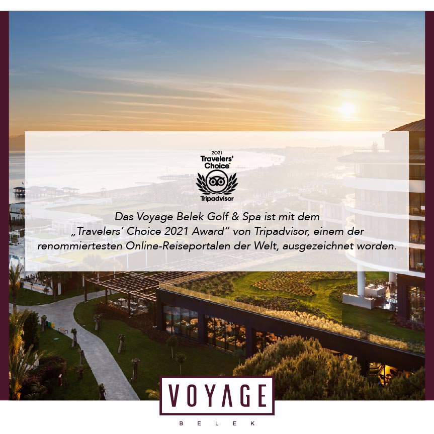 Das Voyage Belek Golf & Spa ist mit dem „Travelers‘ Choice 2021 Award“ von Tripadvisor, einem der renommiertesten Online-Reiseportalen der Welt, ausgezeichnet worden.